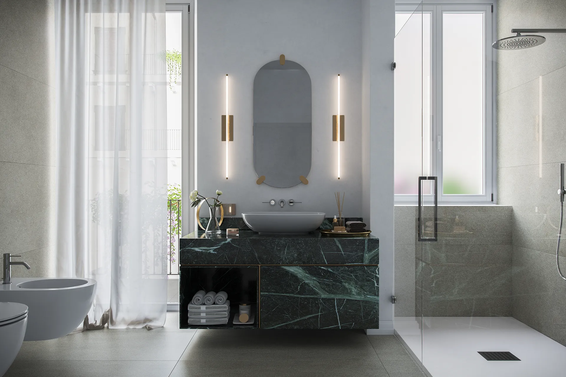 Il bagno, luogo dove iniziano e finiscono le nostre giornate, non è più uno spazio di servizio, ma una vera e propria camera dove trascorriamo sempre più tempo per il relax, a volte perfino per un'attività fisica leggera. Per questo, i bagni di Residenza Scala riflettono la stessa qualità riservata ai materiali e alle finiture nel resto della casa.